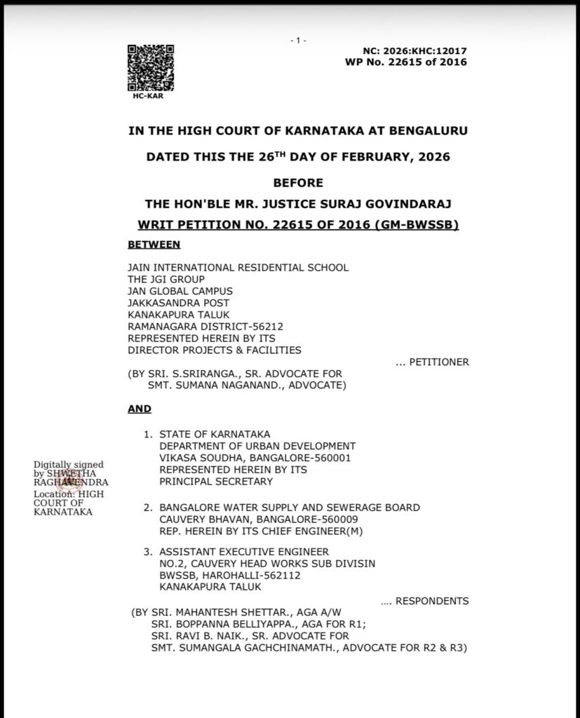 High Court backs BWSSB in ₹12 crore water charge row, rejects Jain International School petition