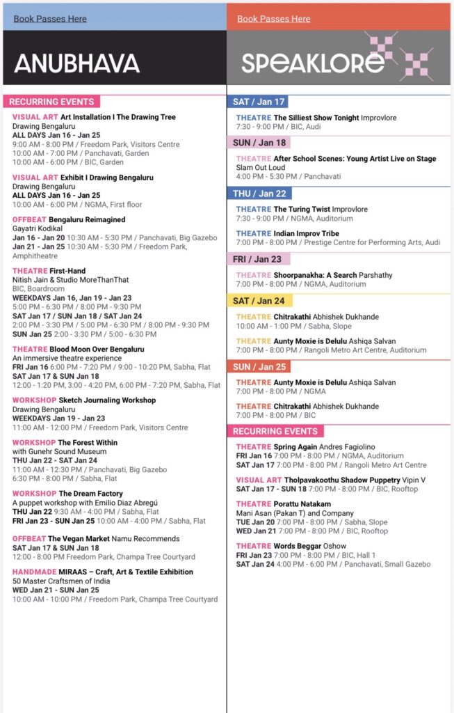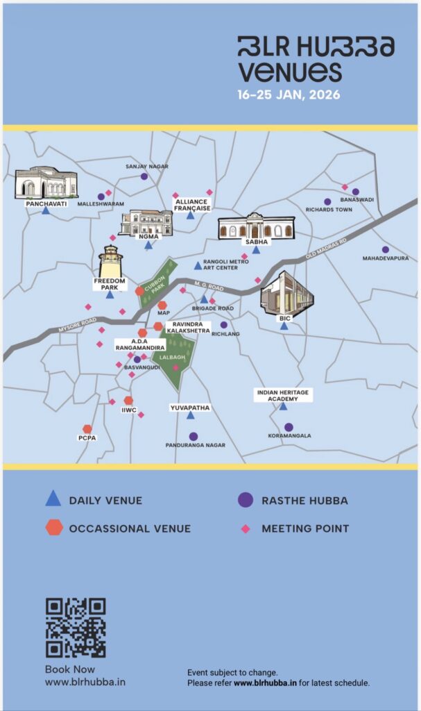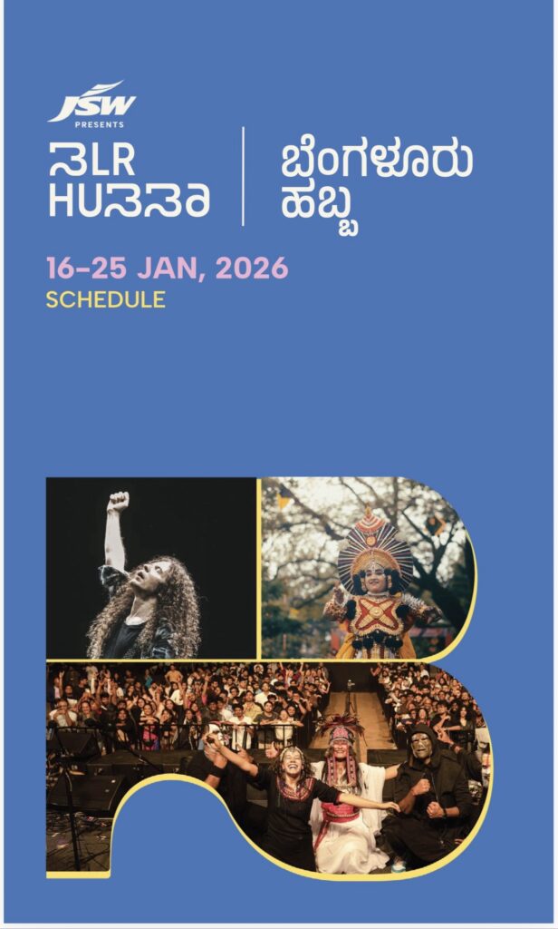 Presented by JSW with support from the Government of Karnataka, BLR Hubba brings together theatre, music, dance, visual arts, films, heritage walks and food festivals across more than 20 venues in the city, including Freedom Park, Ravindra Kalakshetra, Bangalore International Centre, National Gallery of Modern Art, Alliance Française and Rangoli Metro Art Centre.