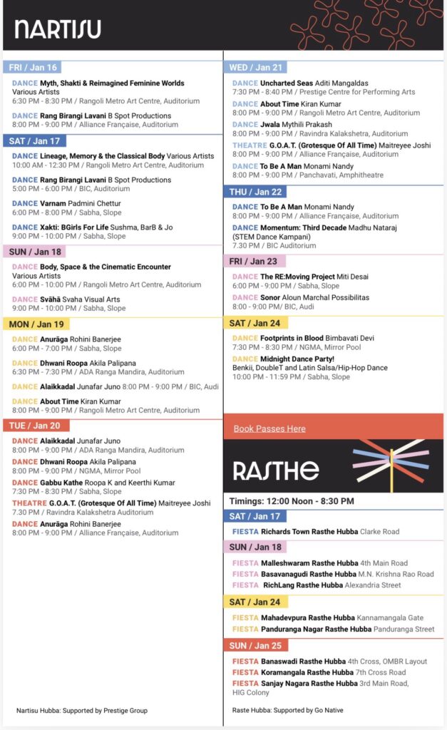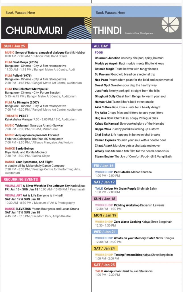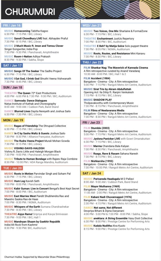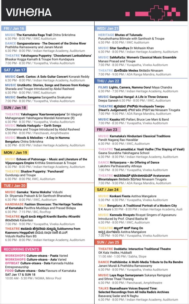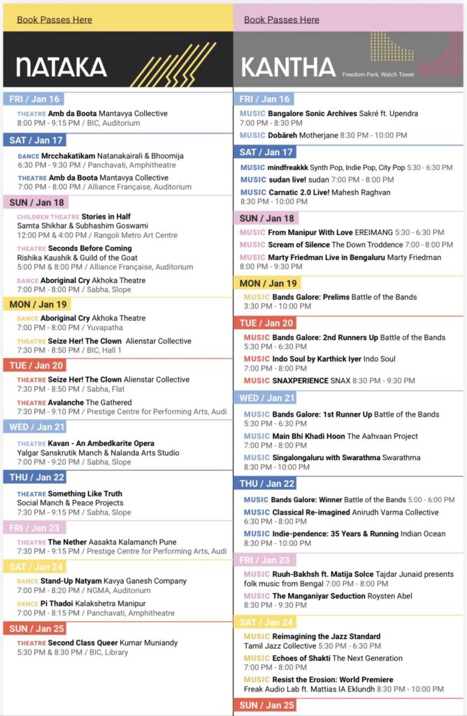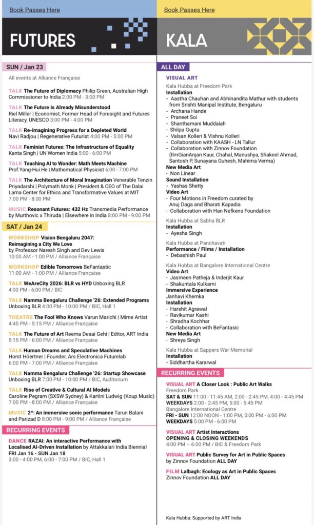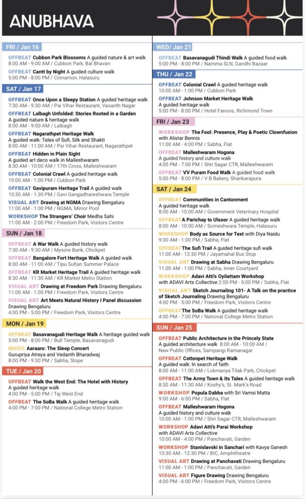 Apart from stage performances, the schedule includes public art installations, film retrospectives on Bengaluru, guided heritage walks, workshops and discussions on urban futures. Several events will be ticketed, while many programmes—especially those in public spaces—will be free and open to the public.