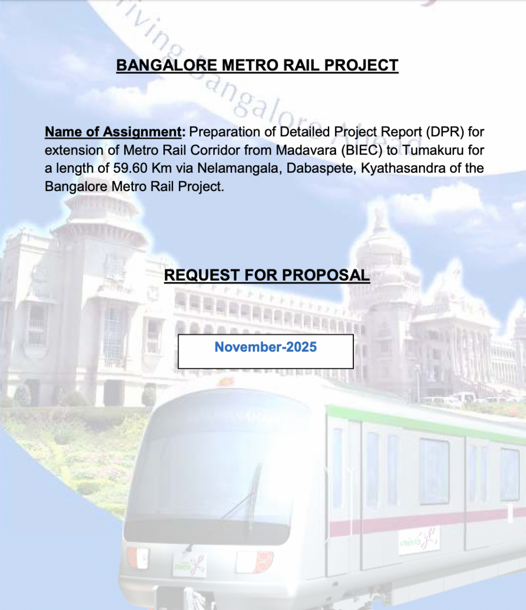 According to the newly issued RFP (No. BMRCL/Madavara (BIEC)-Tumour/DPR/Consultancy/2025/142), the Tumakuru DPR will be taken up through a single-stage, single-cover tender. BMRCL has prohibited joint ventures or consortiums, allowing only single-entity bidders.