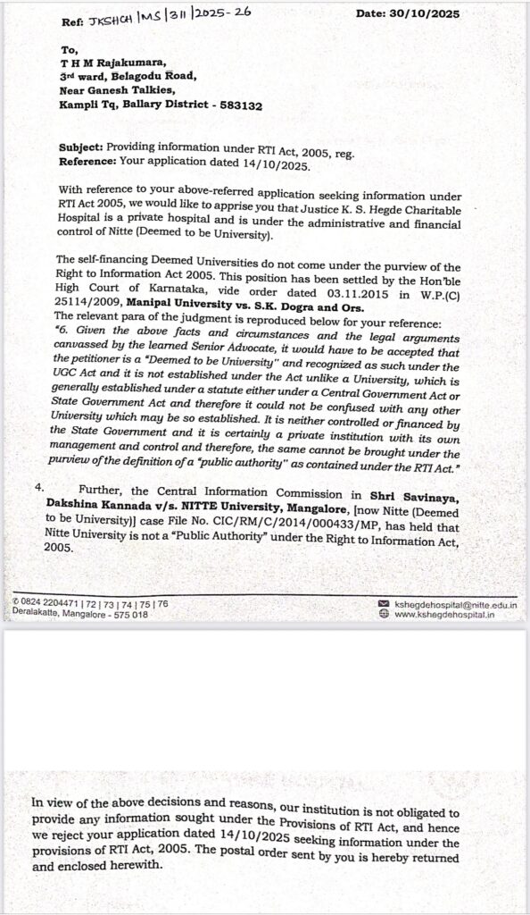 In its official response dated October 30, 2025, K S Hegde Hospital clarified that it is a private hospital under the administrative and financial control of Nitte (Deemed to be University). Citing a 2015 Karnataka High Court ruling (W.P.(C) 25114/2009, Manipal University vs. S.K. Dogra and others), the hospital stated that deemed-to-be universities are private entities and do not fall under the definition of “public authority” as envisaged by the RTI Act. The hospital also referenced a 2014 Central Information Commission ruling (Savinaya, Dakshina Kannada vs. Nitte University) which reaffirmed that Nitte University, as a self-financing private institution, is not obligated to provide information under RTI provisions. Consequently, the hospital returned the postal order submitted with the RTI request and formally rejected the application.