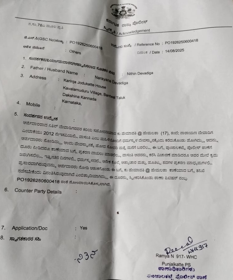 After showing the SIT’s acknowledgment, the Punjalkatte police finally admitted Devadiga’s complaint as a petition on August 14, 2025, and began a probe. The police have since visited the family thrice and collected all details about Hemalatha.