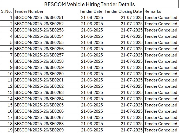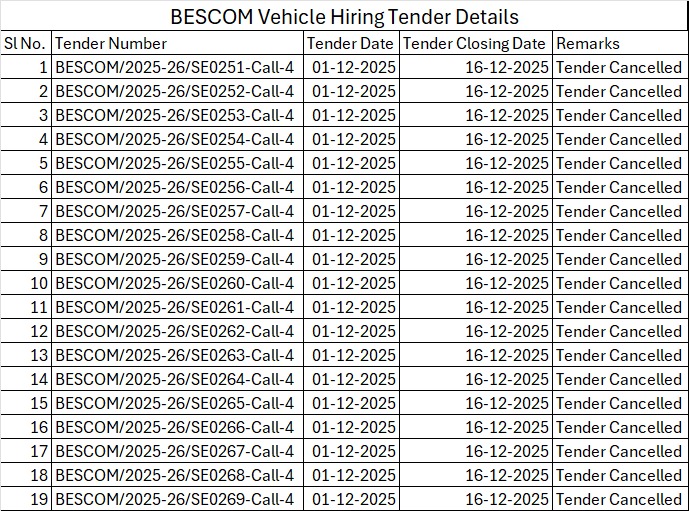 A detailed review of tender records has revealed that the Bangalore Electricity Supply Company (Bescom) floated its vehicle-hiring tender as many as five times over a six-month period between June 2025 and January 2026, with each bidding cycle ending without finalisation or award of contract.