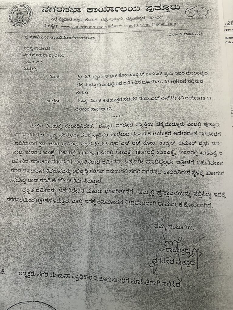 Municipal authorities have internally acknowledged the encroachment and its consequences. Records show that Puttur Town Municipal Council Commissioner on March 25, 2025 wrote to the member secretary of Puttur Planning Authority saying that Raksha S R has encroached STP land. The letter by the commissioner asked the planning authority not to approve the layout located adjacent to the STP land. Despite this approval was given for the layout highlighting builder-officials nexus and alleged corruption.