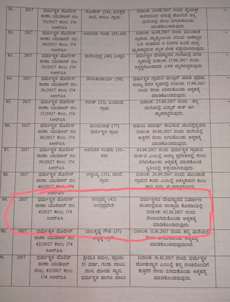 In this particular case, the UDR registered by the Dharmasthala police does not specify the reason for death but merely states that an Andhra woman died by hanging. (The word “hanging” is used here as mentioned in the report.)