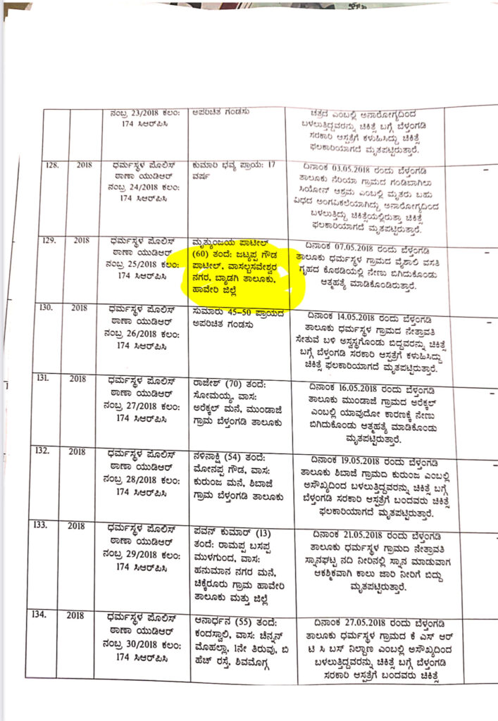 However, when comparing this with the UDR list of the Dharmasthala police station, it is now found that the police registered the case without mentioning Netravati’s name. The UDR number is 25/2018. It states, “on May 7, 2018, Mrityunjaya Patil ended life by hanging inside a room at Vaishali guest house.” The UDR explicitly leaves out his wife.