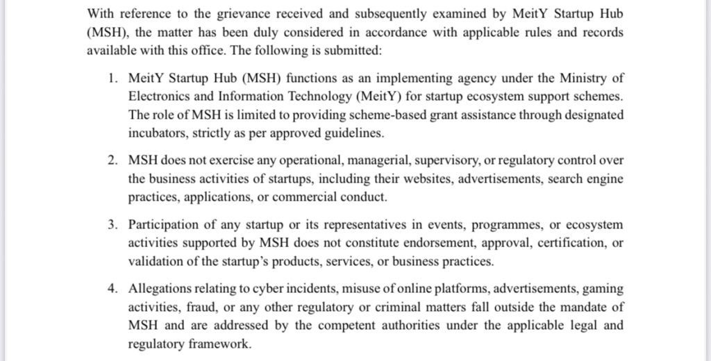 In an official response, MSH stated that participation of startups or their representatives in events, programmes, or ecosystem activities supported by the Hub does not amount to endorsement, approval, certification, or validation of their products, services, or business practices. The agency underlined that its engagement with startups is strictly limited to scheme-based support.