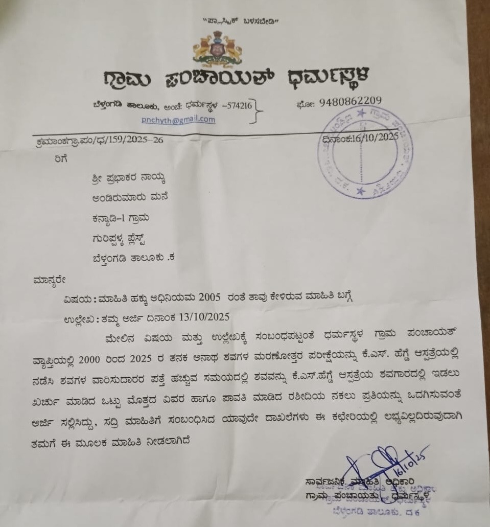 The absence of such documents highlights gross negligence on the part of panchayat officials. Even if K S Hegde Hospital had provided the service free of cost, the panchayat should have maintained proper records. The lack of documentation raises serious suspicion. The Special Investigation Team (SIT) probing the mass burial case must question the panchayat regarding this lapse.