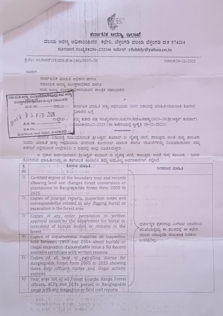 Ashwin Kumar B, an RTI activist from Sullia taluk in Dakshina Kannada district, had sought six different details from the KFD. The information requested includes certified copies of the boundary map and all records reflecting land-use changes, forest conversions, or plantations carried out in Bangle Gudde forest in Dharmasthala village from 2005 to 2025. He also sought copies of internal reports, inspection notes, and all correspondence relating to any digging, burial, or excavation activities within the forest area.